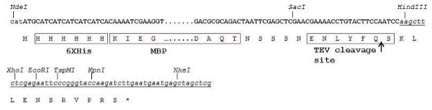 Nucleotide sequence: Product image shows nucleotide sequence encoding the polyhistidine tag, and the first few N-terminal and the last few C-terminal residues of MBP, along with the corresponding amino acid sequences in single letter code. The Multiple Cloning Site sequence is underlined